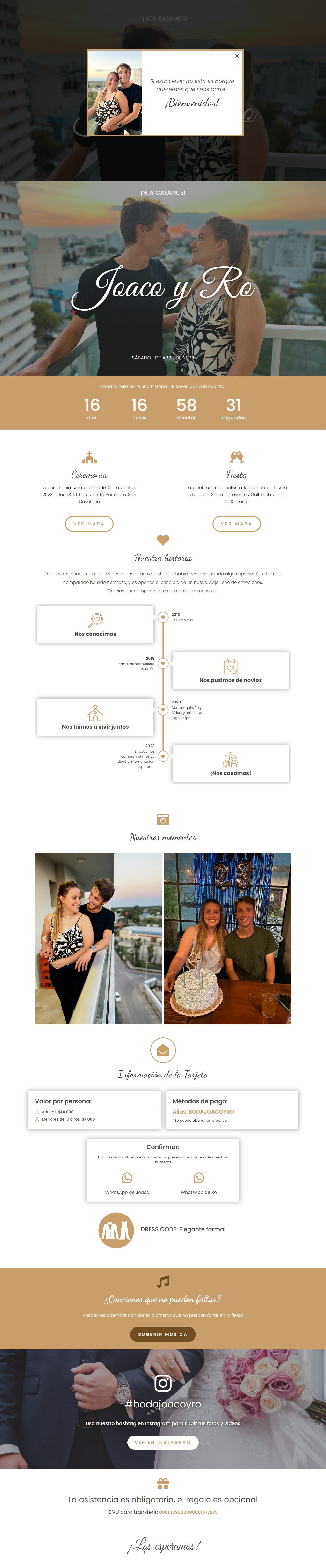 Nuestra Historia es una tarjeta de invitación web para el casamiento de Joaco y Ro. En esta landing page se puede ver la fecha de casamiento, su historia, un contador de tiempo, codigo de vestimenta, galeria de imagenes, ubicacion de la ceremonia y de la fiesta, etcétera. Además tiene un pop-up de bienvenida.